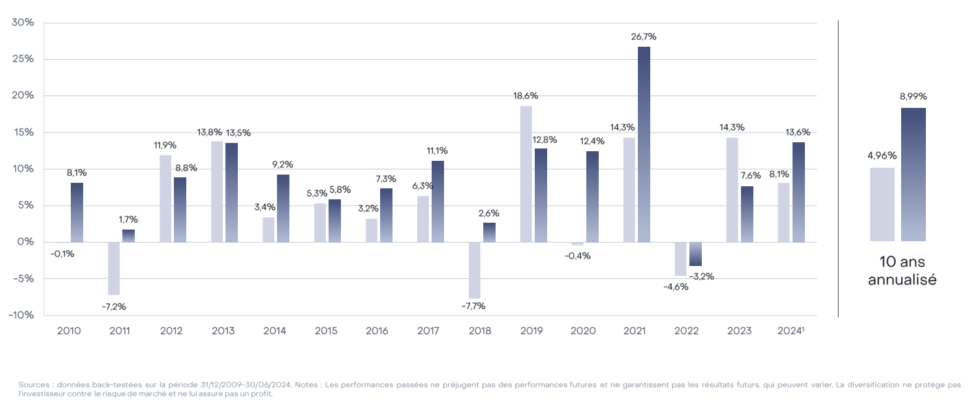 Lecture : rendement annuel sur 15 ans du X Fund (backtest, en bleu foncé) et d’un portefeuille classique 60/40 (en bleu clair).